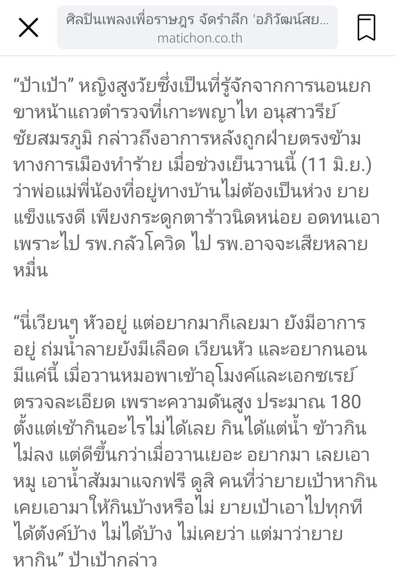 'ป้าเป้า' ขวัญใจชาวม็อบ โดนตั้งข้อหาหนัก หลังถูกเจ้าหน้ … แม่ฝากเพื่อนเลี้ยงลูกวัย 4 ขวบ ถูกทำร้ายสาหัส เลือดคั่งในสมอง ตาบอด ผู้ก่อเหตุต่อรองชดใช้ 3 แสน. ร่วมกันทำร้ายร่างกายเจ้าพนักงาน โดยมีหรือใช้อาวุธ จะถูกคุมตัวไว้ 2 คืน ก่อน ตร. ป้าเลียบ เหยื่อคมมีด ยังกล่าวอีกว่า ที่ผ่านมาหลังจากป้าถูกพระโหดทำร้ายญาติๆป้า พาป้าเดินทางไปแจ้งความกับพนักงานสอบสวน สภ.สวรรคโลก. และฝากบอกว่า ไม่ต้องเป็นห่วง ยายแข็งแรงดี กระดูกตาร้าวนิดหน่อย อด.